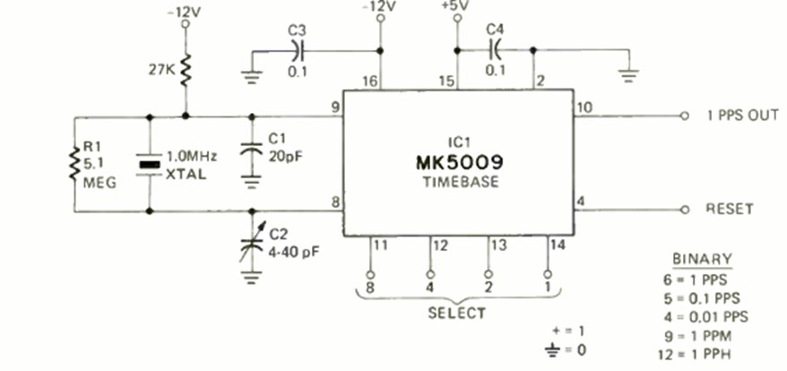 Esta base de tiempo de cristal es parte de un proyecto publicado en la revista Radio Electronics en agosto de 1972. La frecuencia la da el cristal. El circuito es un divisor de frecuencia que utiliza un cristal de 1 MHz para proporcionar 1 pulso por segundo. O según lo seleccionado.
