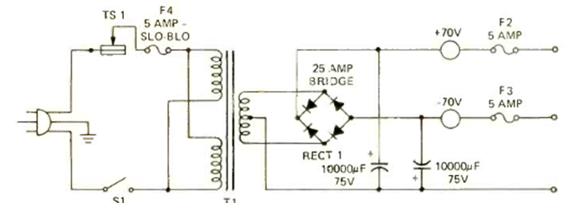 Este circuito es la fuente de alimentación del amplificador del circuito anterior. El transformador es de 5 A con una tensión de 45 V, obteniendo 70 V tras la rectificación.