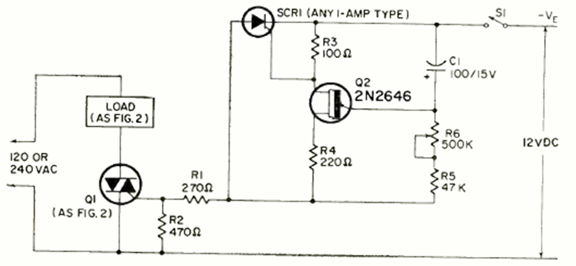 Este circuito apaga una carga después de un intervalo de 8 a 80 segundos ajustado por el potenciómetro. El circuito es de Radio Electronics de junio de 1970. El tiempo depende de C1 y se puede cambiar.