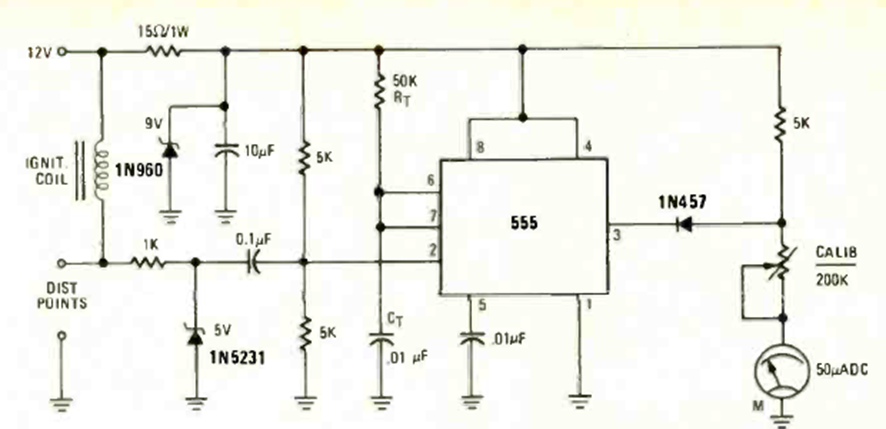 Otro de los muchos circuitos de tacómetro que tenemos en nuestra web. Esto es de la revista Radio Elecronics de septiembre de 1976. El circuito está conectado a los contactos de la placa de platino de un automóvil o a un sensor.