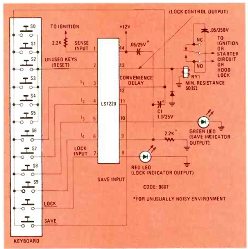 Este circuito lo encontramos en una revista de Radio Electrónica de enero de 1983. Utiliza un circuito integrado específico para este tipo de aplicaciones. El circuito activa un relé si se activa la combinación de teclas correcta.