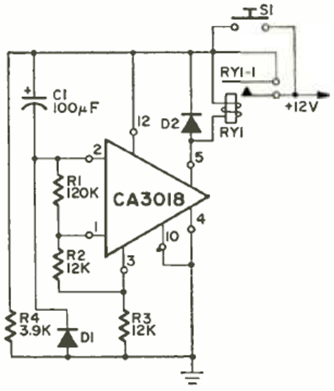 Esta aplicación del circuito integrado RCA lanzado en ese momento se encontró en la edición de agosto de 1970 de la revista Radio Electronics. El relé debe tener una resistencia superior a 240 ohms. El tiempo lo da C1.