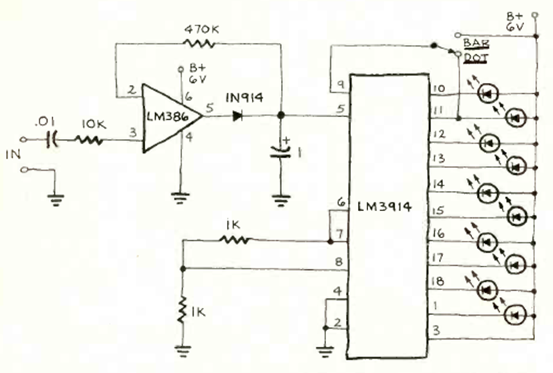 En la figura tenemos una forma sencilla de tener un indicador de gráfico de barras de pico. El amplificador es del tipo audio, pero se puede utilizar operacionales. El circuito es de una Radio Electronics de marzo de 1980.