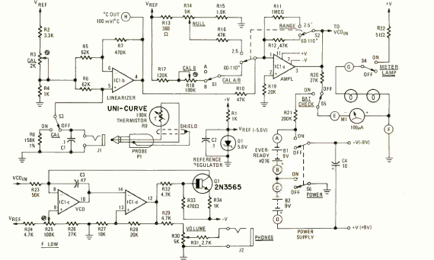 Este circuito se encontró en la revista Radio Electronics de febrero de 1976. El circuito es bastante sofisticado y utiliza un sensor de acción rápida (termométrico) y un indicador analógico.