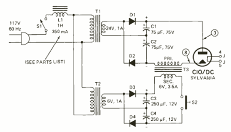 Este es un circuito diferente para un componente del pasado, la lámpara de arco de circonio utilizada en los proyectores. El circuito es de una revista Radio Electronics de agosto de 1972.