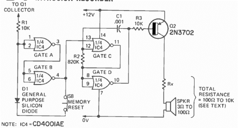 Este circuito es para una sirena que se puede utilizar con cualquiera de las alarmas anteriores y también de otros tipos. El circuito es de una revista Radio Electronics de mayo de 1975.