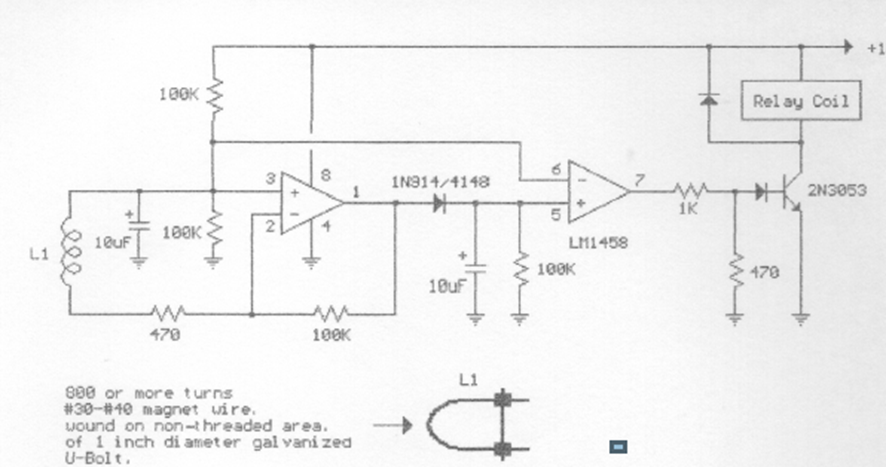 Este circuito, encontrado en documentación de los años 90, activa un relé con señales inductivas aplicadas a un enlace. La sensibilidad depende de la frecuencia y la potencia depende del relé utilizado.