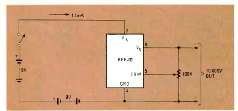 Este es un circuito con un componente de período que consistía en una referencia de voltaje. El circuito es de una empresa Radio Electronics de febrero de 1981. En este circuito la tensión de salida se puede ajustar exactamente a 10 V.