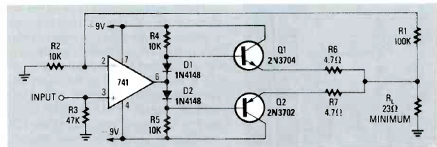 Este amplificador de audio con transistores de uso general en la salida fue encontrado en la revista Radio Electronics de marzo de 1990. La fuente de alimentación debe ser simétrica.