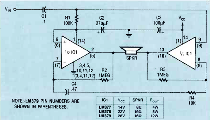 Con varias opciones de circuitos integrados, este amplificador puede proporcionar diferentes potencias dependiendo de la elección del circuito integrado. Lo encontramos en la revista Radio Electronics de abril de 1990.