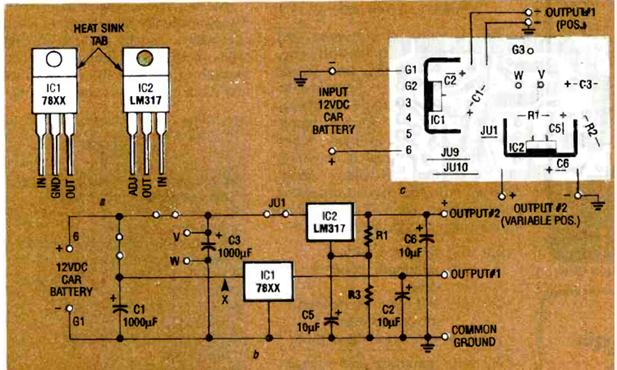 Esta fuente de alimentación de batería de automóvil se encontró en la edición de junio de 1990 de la revista Radio Electronics. Los circuitos integrados deben estar equipados con disipadores de calor.