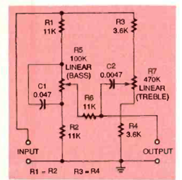 Este circuito pasivo fue encontrado en la revista Elexctonics Now de marzo de 1995. El circuito es para graves y agudos, y ofrece una atenuación que es necesario compensar.