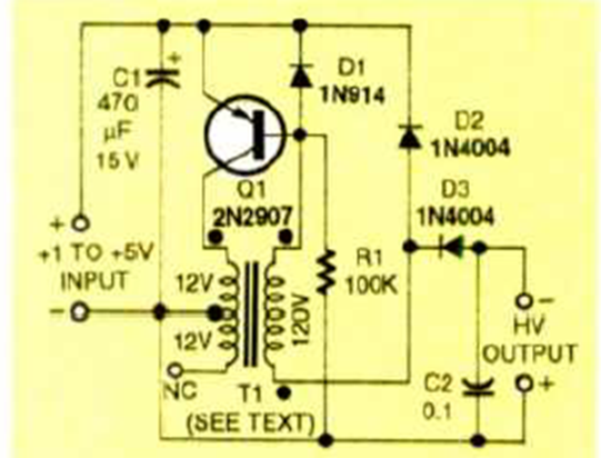 Para experimentos con cámaras de ionización y válvulas Geiger, este circuito genera alta tensión a partir de baterías. El circuito es de una revista Electronics Now de enero de 1994.