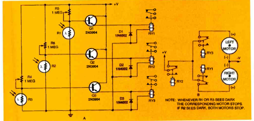Encontramos este circuito en la revista Electronics Now de octubre de 1996. El circuito utiliza LDR como sensores y activa relés. Los relés deben tener tensiones acordes a la fuente de alimentación.