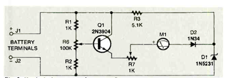 Este circuito fue encontrado en la edición de marzo de 1997 de la revista Electronics Now. Utiliza un indicador analógico común y el transistor es de propósito general.