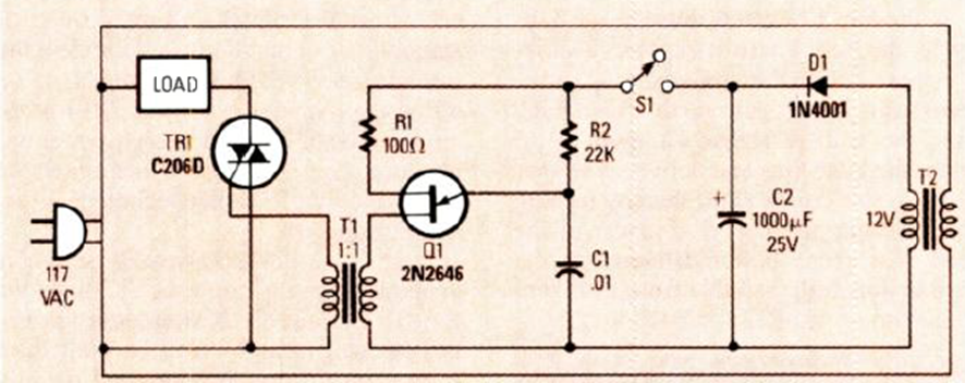 Este circuito es uno de los muchos de su tipo que se pueden encontrar en este sitio. Esto es de Radio Electronics de septiembre de 1987. El triac debe controlarse según la carga.