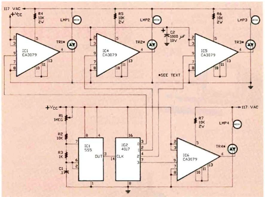 Encontramos este circuito en la revista Radio Electronics de febrero de 1987. Se basa en un disparador triac RCA integrado disponible en ese momento. El circuito alimenta 4 lámparas incandescentes.