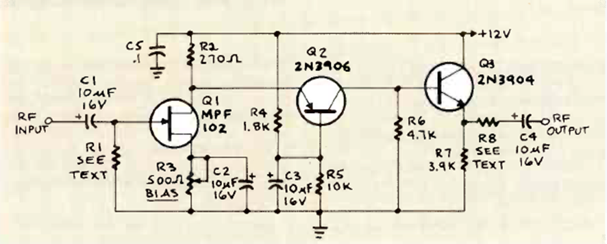 Este circuito para señales de RF se encontró en la revista Radio Electronics de marzo de 1987. Los transistores son de uso general para frecuencias de hasta 3 MHz. El circuito tiene una ganancia de aproximadamente 30 dB.