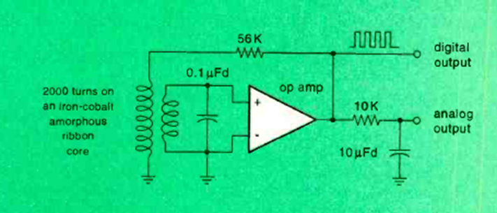 Este circuito detecta cambios en el flujo magnético en una bobina mientras se mueve en un campo magnético externo. El circuito es de una revista Electronics Now de octubre de 1996.