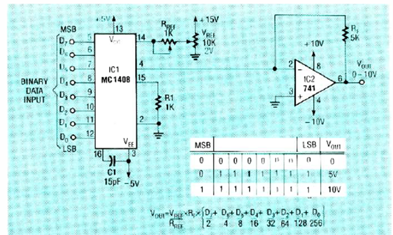 Este circuito se encontró en la edición de julio de 1991 de la revista Radio Electronics. Convierte una señal binaria en un voltaje según la referencia establecida en el potenciómetro. El operador convierte la corriente en tensión.