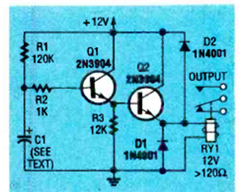 Este circuito de retardo de relé se encontró en la edición de octubre de 1993 de la revista Electronics Now. La temporización viene dada por R1 y C1 y puede modificarse.