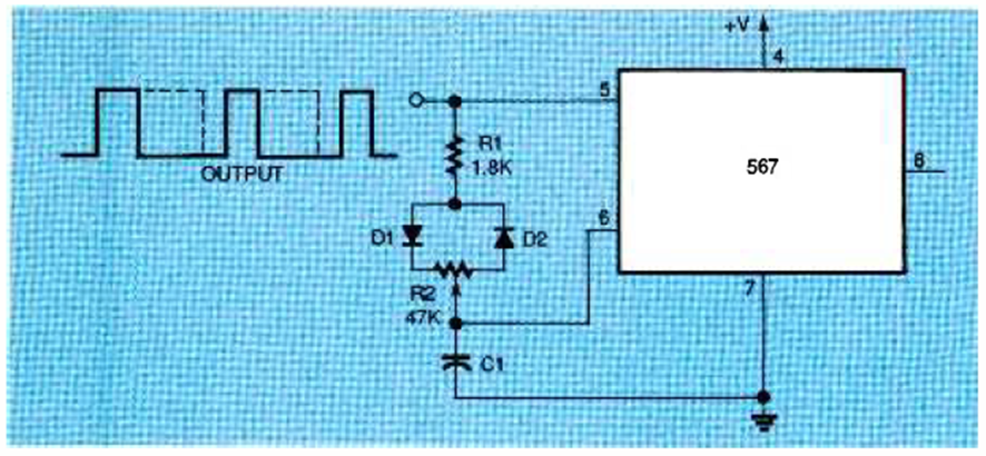 Este circuito generador de espaciador variable se encontró en la edición de diciembre de 1994 de la revista Electronics Now. La frecuencia depende de C1 y puede alcanzar un máximo de 200 kHz.