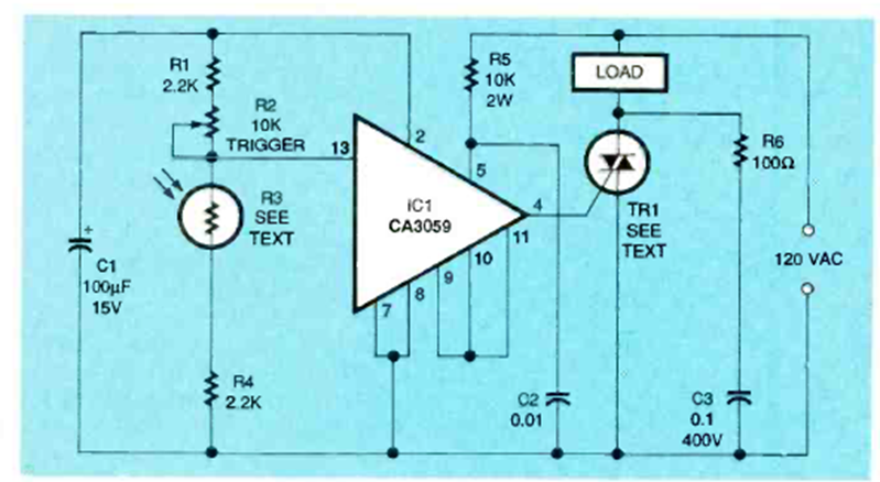 Usando un CA3059 este circuito fue encontrado en la revista Electronics Now de julio de 1995. El triac debe estar equipado con un disipador de calor.