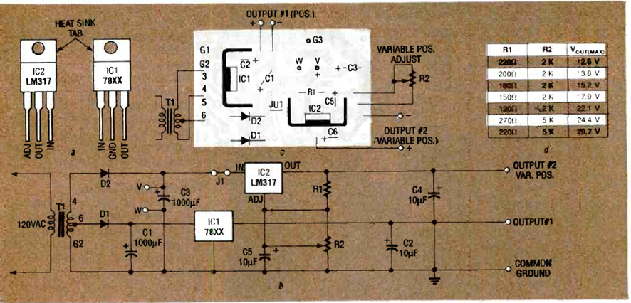 Este circuito se encontró en la edición de junio de 1990 de la revista Radio Electronics. Los circuitos integrados deben estar equipados con disipadores de calor. Se sugiere un diseño de placa.