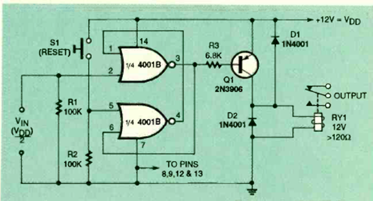 Utilizando el circuito integrado 4001, este relé de enclavamiento puede emplear cualquier transistor de propósito general. La alimentación se realiza mediante relé con tensión hasta 12 V.