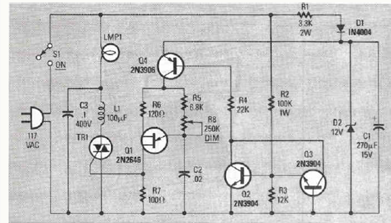 Encontrado en la revista Radio Electronics Experimenter de 1989, este circuito utiliza varios transistores, uno de los cuales es unijuntura. El triac debe estar acorde con la lámpara, que debe ser incandescente.