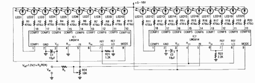 Este circuito es una alternativa al circuito anterior. Lo encontramos en el mismo artículo de la revista Radio Electronics de marzo de 1992. Los circuitos integrados son los LM3914.