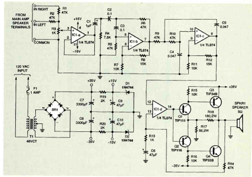 Este circuito apareció en un artículo de la revista Electronics Now en octubre de 1995. El circuito incluye una fuente de alimentación. Los transistores de potencia permiten equivalencias.