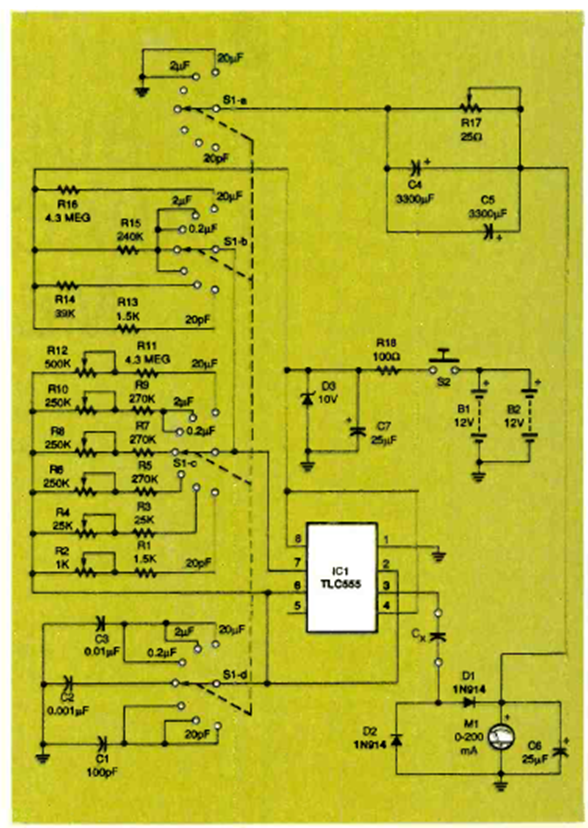 Este circuito puede medir capacitancias en varias escalas utilizando un indicador analógico común. El circuito es de la revista Electronics Now, junio de 1995.