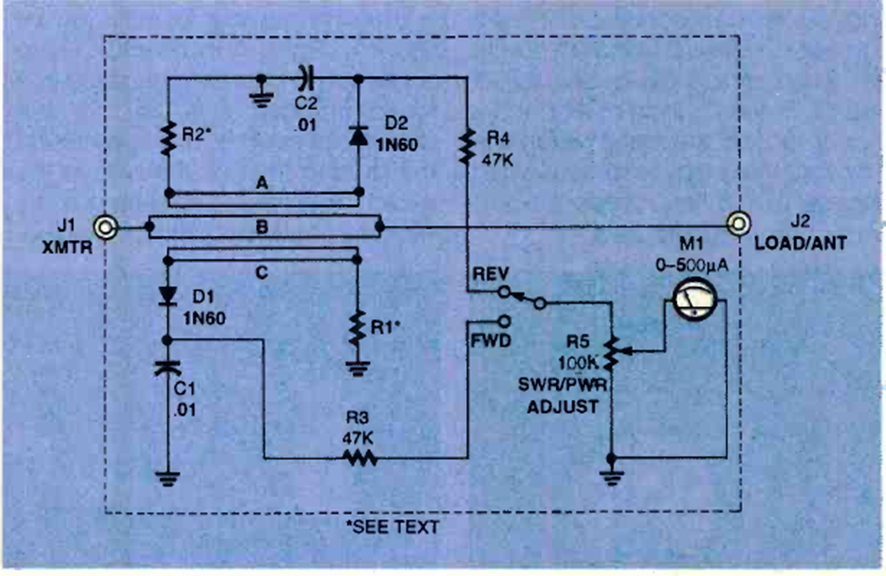 Este circuito fue encontrado en la edición de marzo de 1999 de la revista Electronics Now. El indicador es analógico y no requiere fuente de alimentación. El circuito es para la banda VHF.