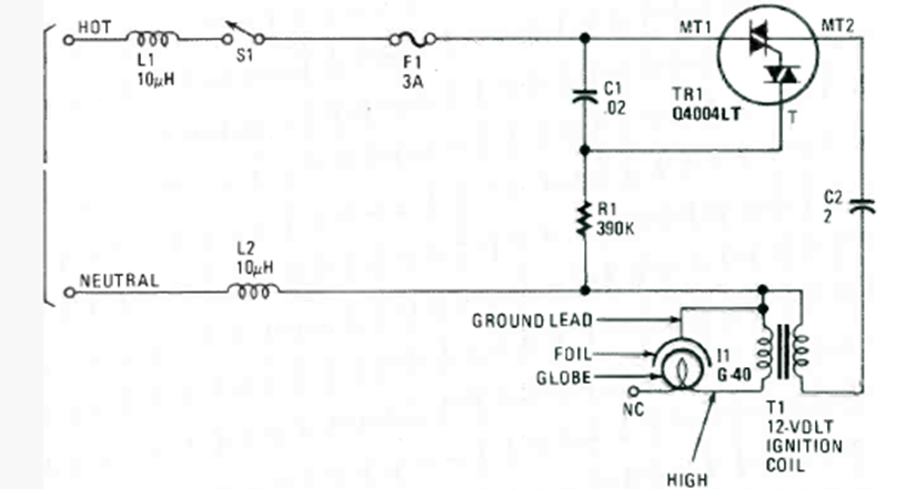Encontramos este circuito en un Experimentador de Radio Electrónica de 1990. El circuito utiliza una bombilla incandescente común y una bobina de encendido de automóvil.