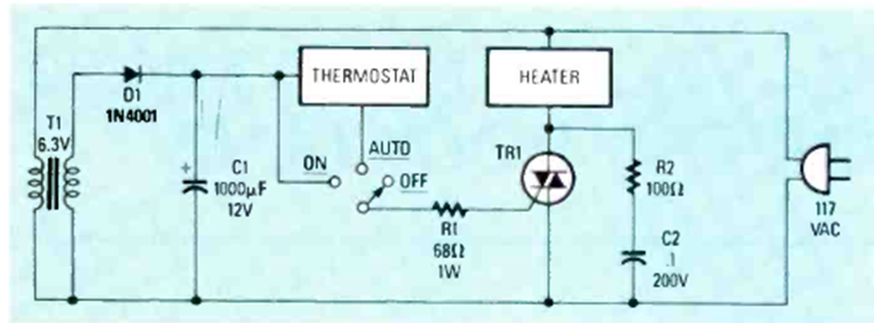 Encontramos este circuito en la revista Radio Electronics de octubre de 1987. El triac debe estar controlado por un calentador. El transformador tiene una corriente baja, del orden de unos pocos cientos de mA.