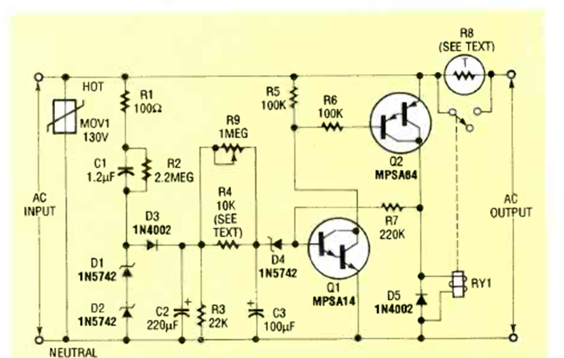 Este circuito fue encontrado en la revista Radio Electronics de diciembre de 1992. R2 es un NTC hay un protector MOV o termistor NTC. La corriente depende del termistor utilizado.