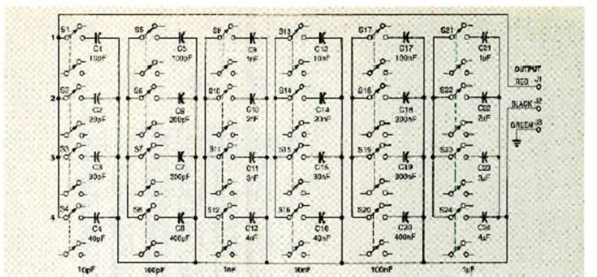 Este circuito de banco se encontró en la edición de febrero de 1998 de la revista Electronics Now. Con él se puede obtener una gama muy amplia de capacitancias para realizar pruebas.
