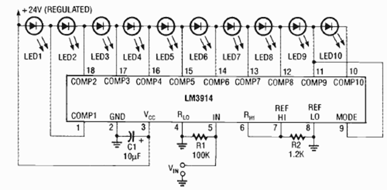 Con un solo LED en la escala, este voltímetro tiene bajo consumo. El circuito fue encontrado en la edición de marzo de 1992 de la revista Radio Electronics.