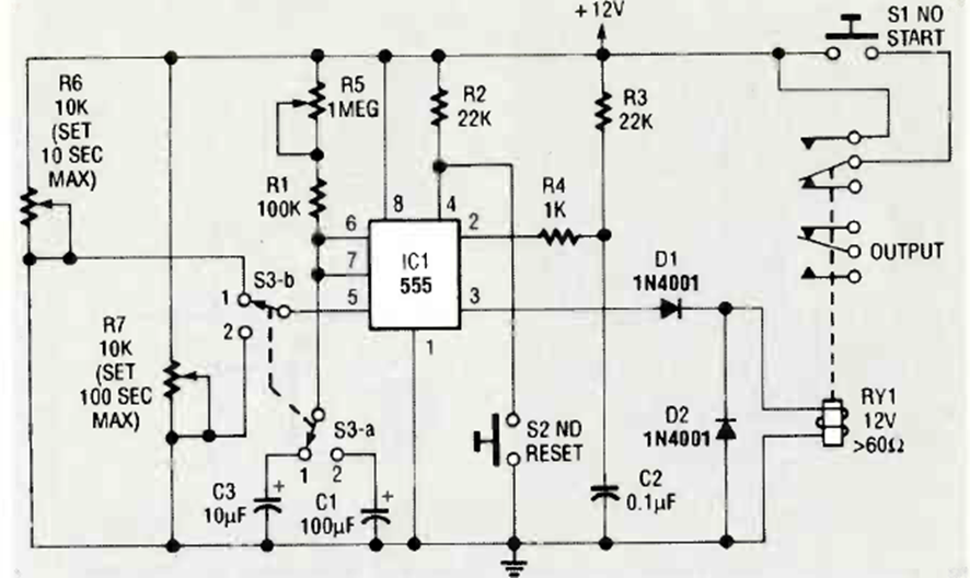 Este temporizador de 100 segundos se encontró en la edición de septiembre de 1992 de la revista Radio Electronics. El circuito tiene dos rangos de temporización y ajuste de tiempo en R6.