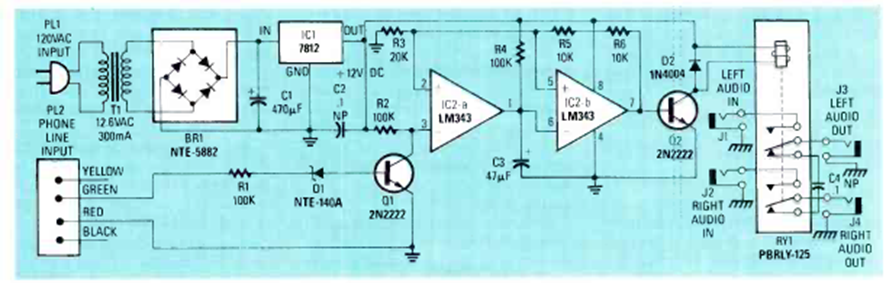Este circuito silencia un sistema al recibir una llamada telefónica. El circuito es de una Radio Electronics de diciembre de 1990.