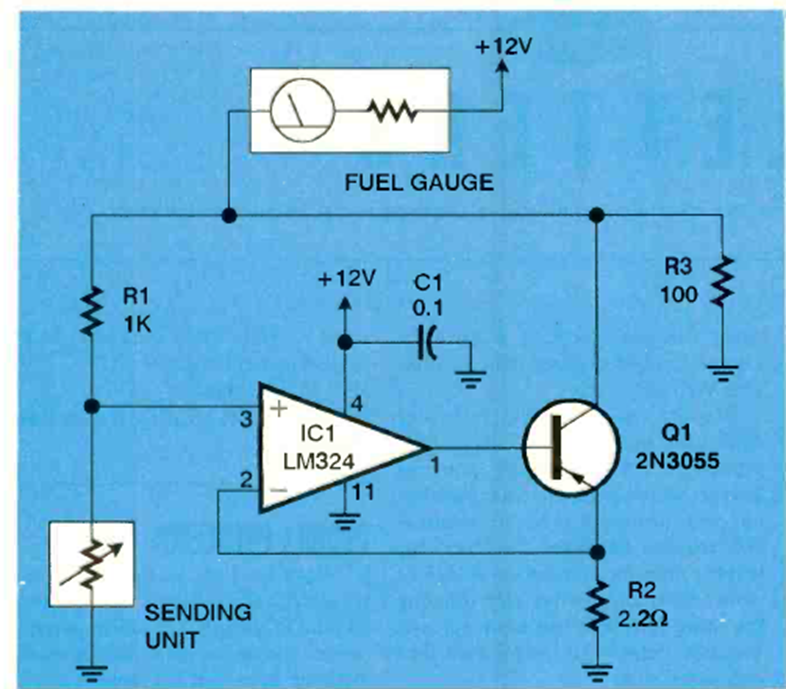 Este circuito automotriz fue encontrado en la edición de junio de 1997 de la revista Electronis now. El circuito utiliza un amplificador operacional común alimentado por 12 V.