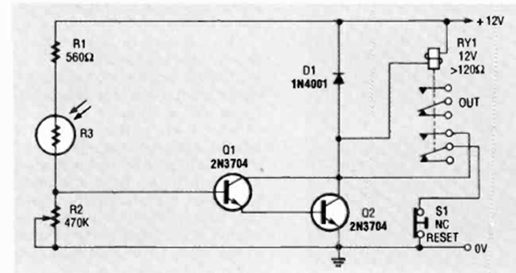 Este circuito simple y sensible fue sugerido por Radio Electronics en julio de 1992. El relé es un relé de conmutación de doble contacto. El ajuste de sensibilidad se realiza en R2.