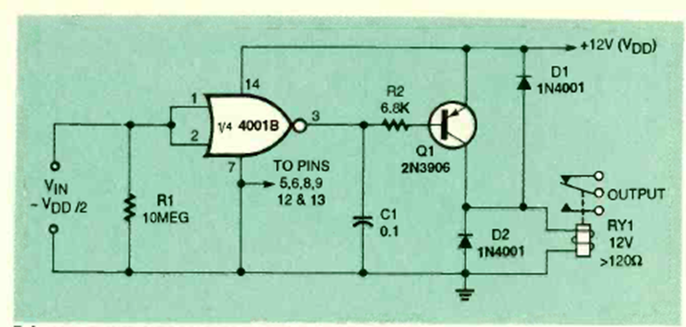 El transistor de este diseño que se encuentra en la edición de julio de 1994 de la revista Elecronics Now puede ser de cualquier tipo de propósito general. El circuito se alimenta según la tensión del relé hasta 12 V.