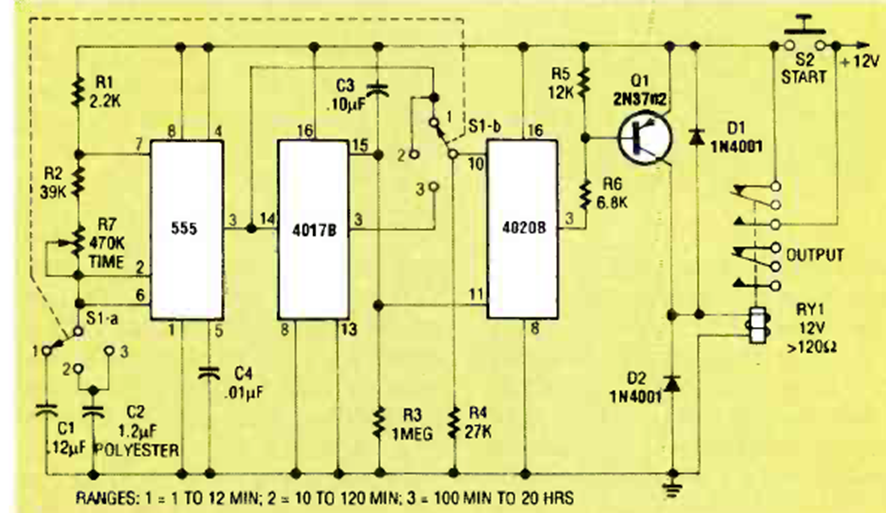 Este circuito se encontró en un artículo sobre el 555 en la revista Radio Electronics de noviembre de 1992. El circuito utiliza un relé de 12 V y tiene dos rangos de temporización.