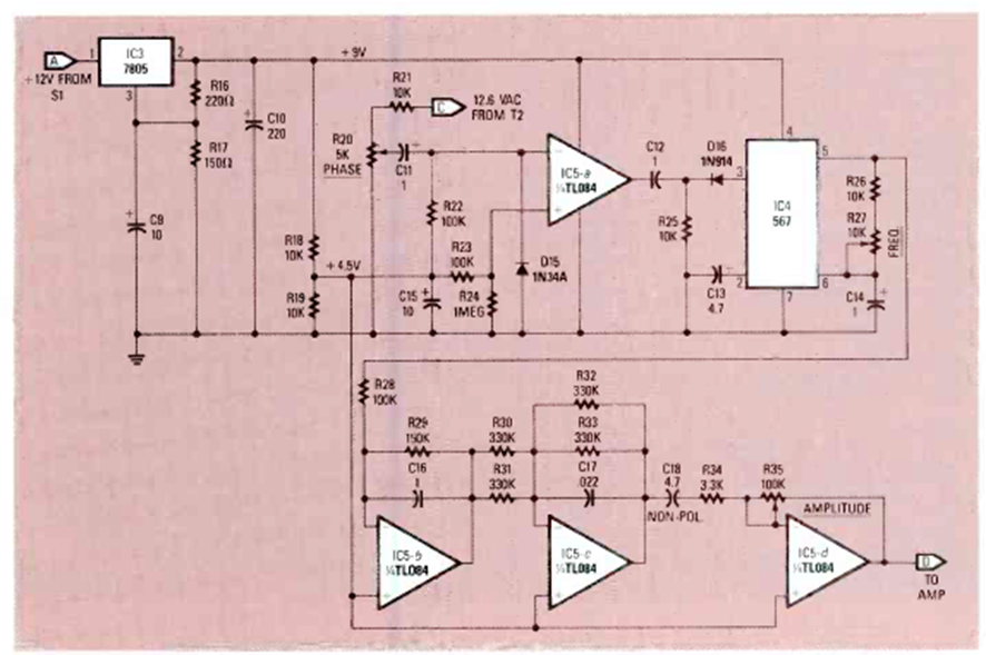 Este circuito fue encontrado como parte de otro proyecto en una revista Radio Electronics de enero de 1988. Las frecuencias están dadas por los capacitores de sincronización.
