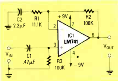 De un artículo de la revista Radio Electronics de mayo de 1989, este circuito requiere una fuente de alimentación simétrica. Este es un amplificador para señales alternas con ganancia 10.