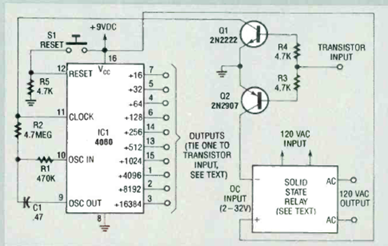 Este circuito para intervalos de tiempo muy largos se encontró en la revista Radio Electronics de marzo de 1993. Se pueden lograr tiempos de varios días o incluso semanas, dependiendo del valor de C1.