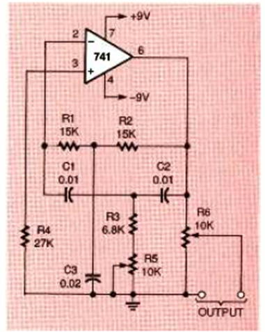 Encontrado en la edición de diciembre de 1995 de la revista Electronics Now, este circuito genera señales sinusoidales. La fuente debe ser simétrica y se pueden utilizar otros amplificadores operacionales.