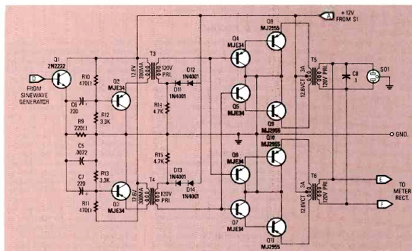 Este circuito inversor fue encontrado en un UPS de una revista de Radio Electronics de enero de 1988. Los datos sobre el transformador deben obtenerse del artículo según la potencia deseada.